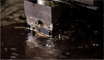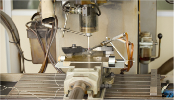 放電加工は、切削のように製品へ大きな負荷をかけられない場合や、深さ・高さのある加工、鋭角形状の加工に用いられます。直径0.2mmの極細銅線に電流を流し、金属を溶かしながら切断していく仕組みで、0.01mm単位という高い精度での加工も可能です。